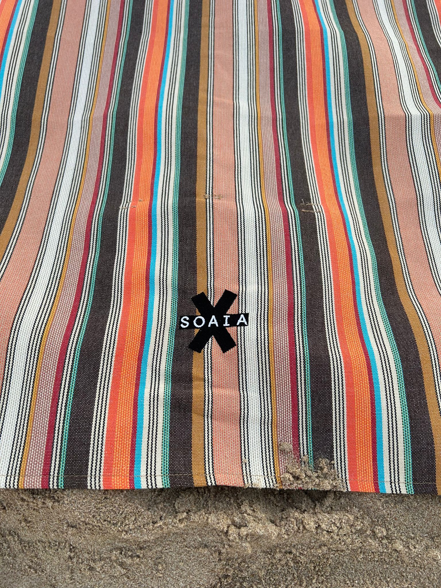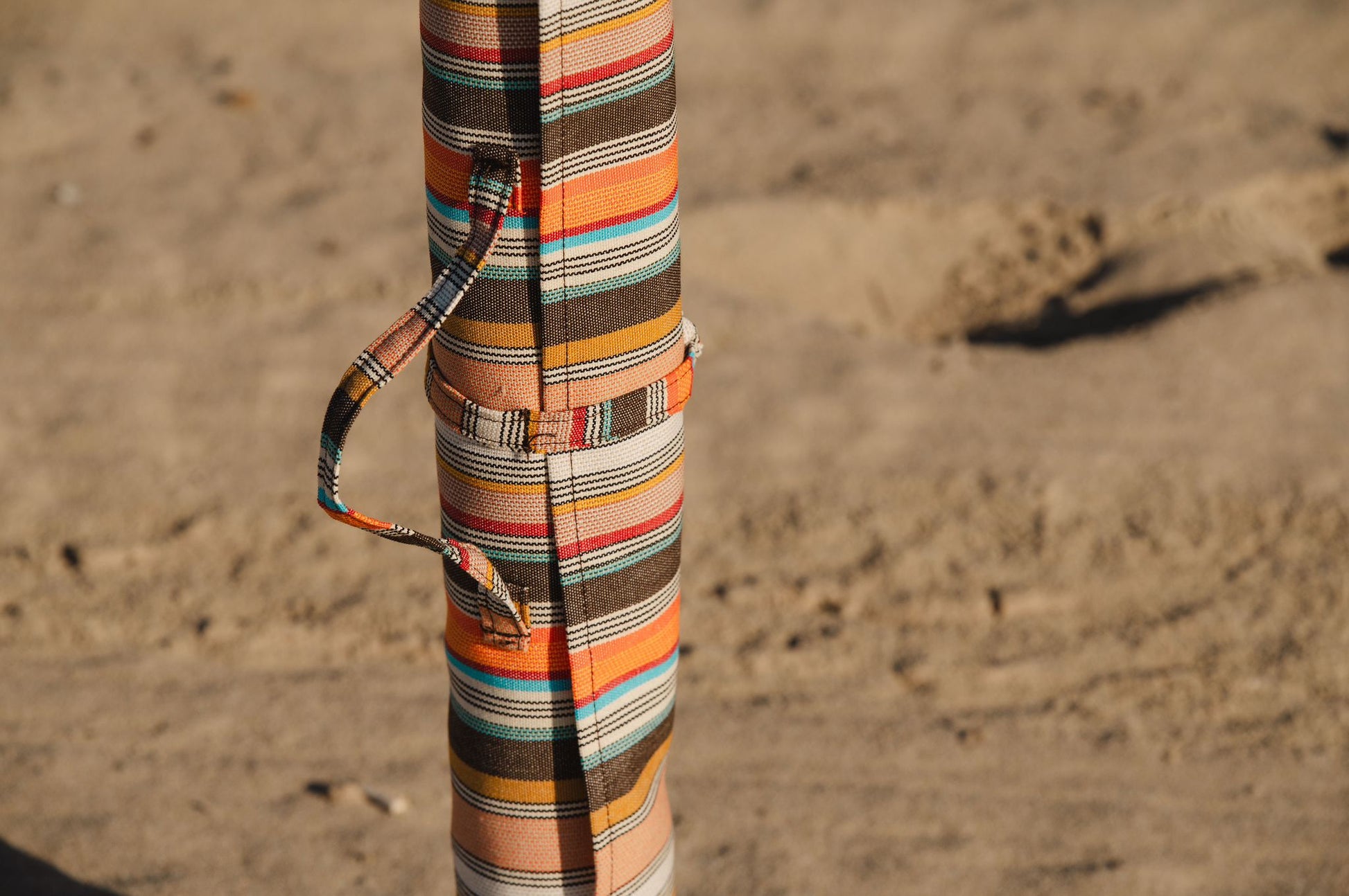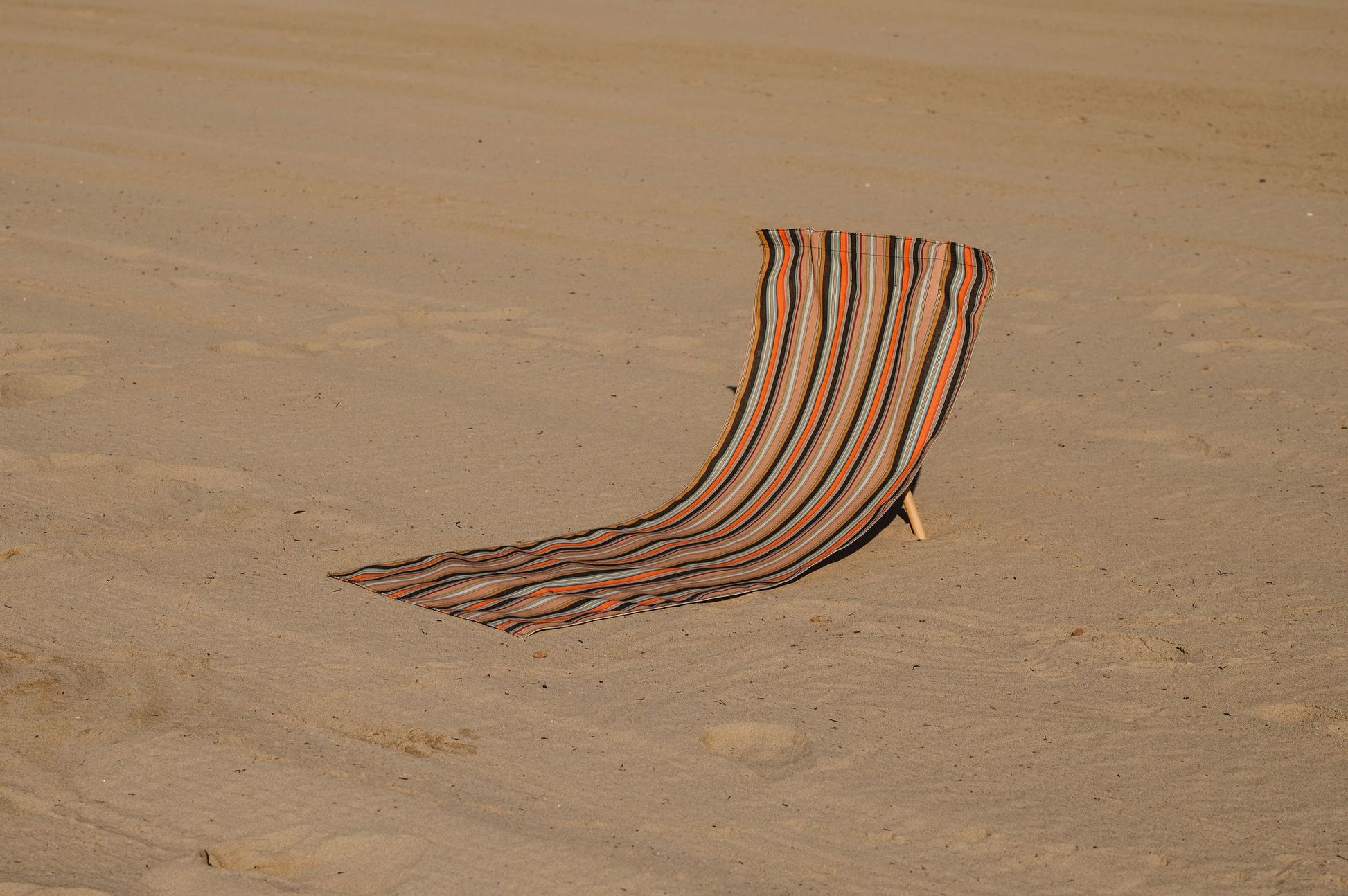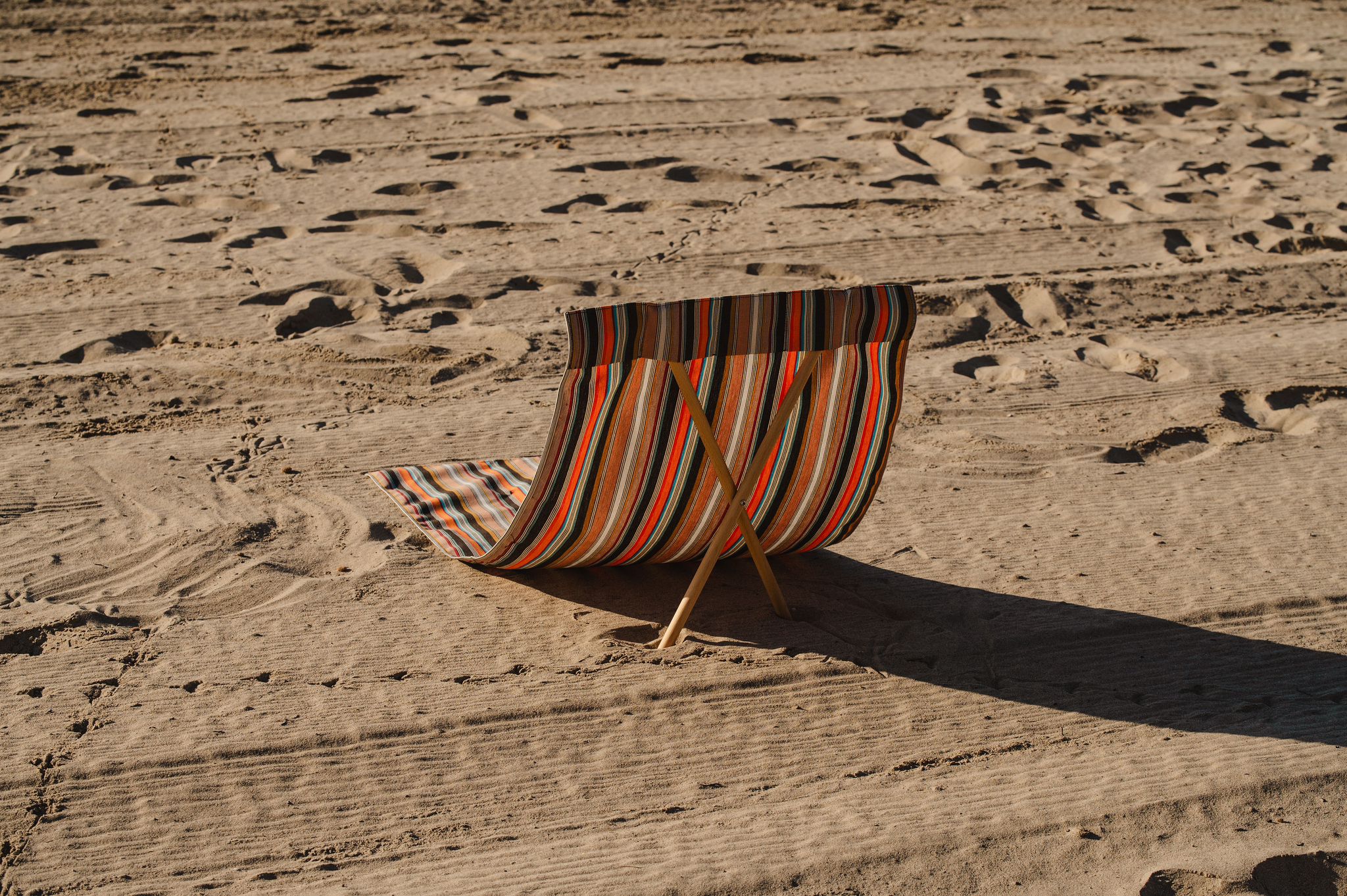 Silla toalla vintage con preciosas rayas de colores. Tela resistente, ideal para tus escapadas, tanto de playa como de camping. Anti manchas de líquidos y con una tela super resistente.